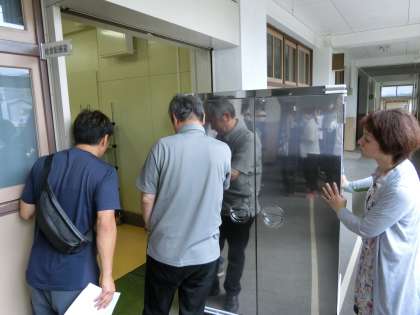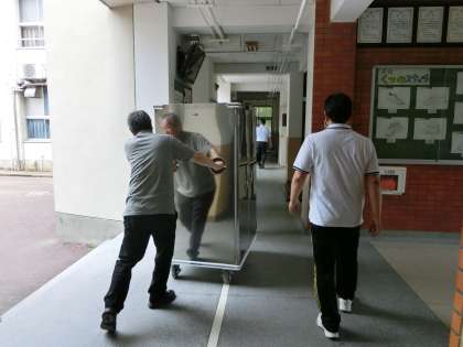 運ばれるコンテナは、一階南館入口より東館廊下を通って、北館一階の配膳室へ。