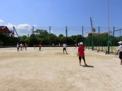 太陽が照りつける中、野球部が練習試合、男子テニス部も汗を流しています。