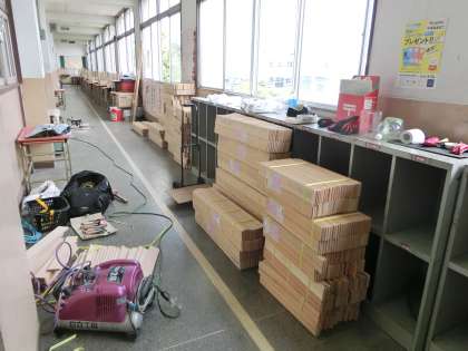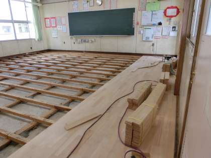 教室の床の張り替え工事。二学期を目前に控え、急ピッチで作業が行われています。