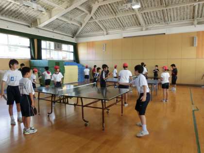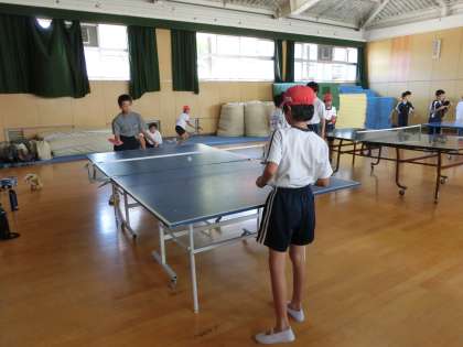 卓球部。格技室が所狭し。先輩とのラリーです。