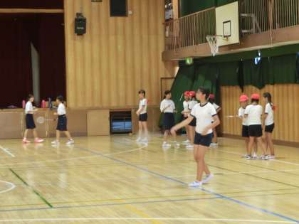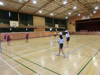 バドミントン部。体育館に入って、シャトルを打つ練習。