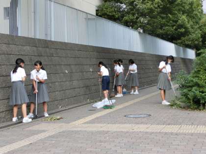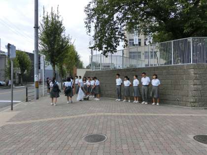 早朝練習を終えた後、吹奏楽部が歩道の掃除をしてくれました。