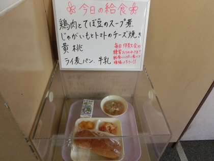 本日のメニューは、「鶏肉と豆のスープ」「じゃがいもとトマトのチーズ焼き」。