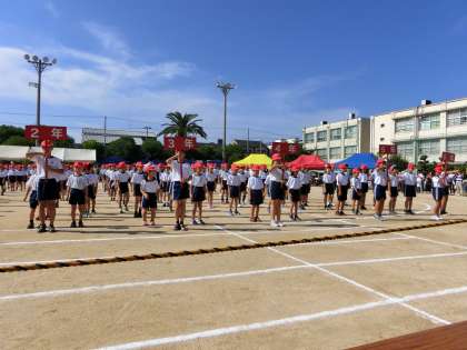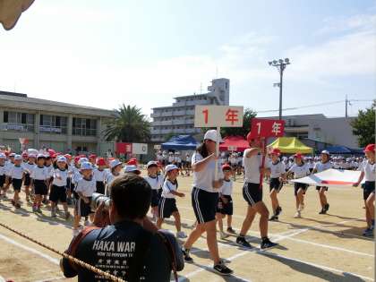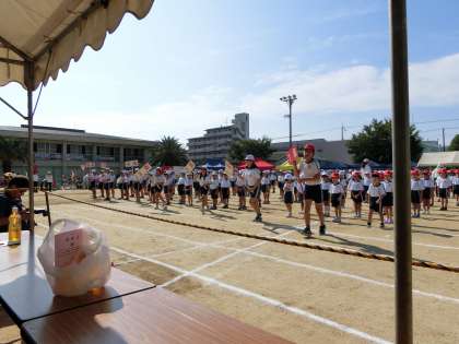 国旗・校旗を先頭に、力強い6年生から、可愛い1年生まで、赤白に分かれての入場行進です。