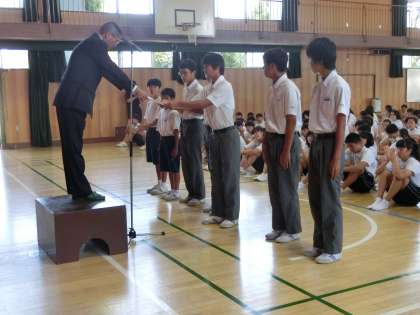 只今、認証式で、今年後半の生徒会役員、学級役員をお願いしました。