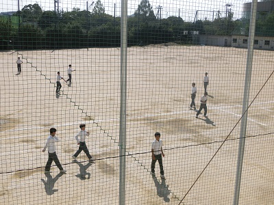 昼休み、男子生徒がグラウンドで遊んでいます。