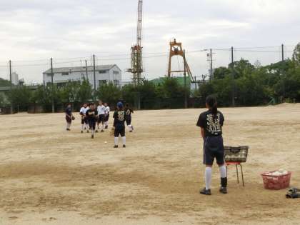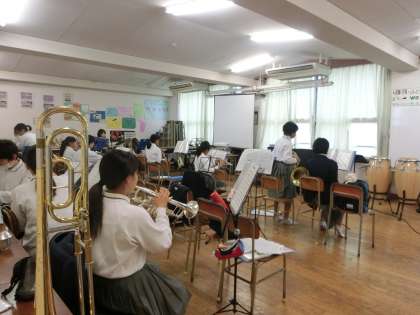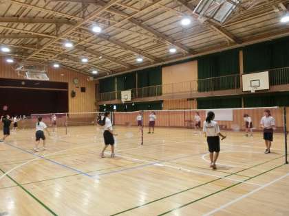 体育館ではバドミントン部、グラウンドではソフトボール部、音楽室では吹奏楽部が活動しています。