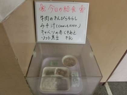 本日のメニューは、「牛肉のきんぴらちらし」「キャベツの赤じそあえ」「具だくさんのみそ汁」です。