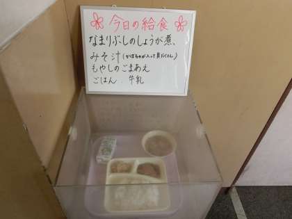 本日のメニューは、「なまりぶしのしょうが煮」「もやしのごま和え」「具だくさんのみそ汁」。