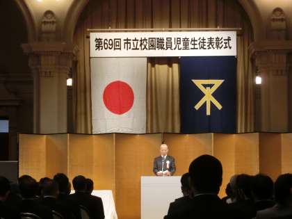 職務精励で表彰を受けた11名の校長先生をはじめ、児童・生徒・教頭・教諭・管理作業員の皆様、本当におめでとうございました。