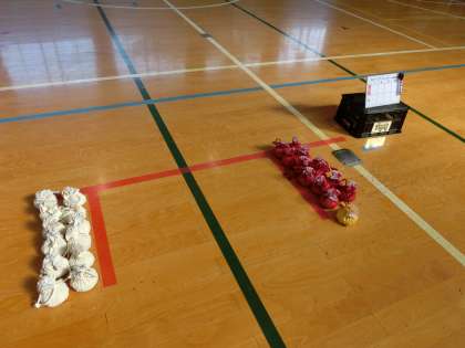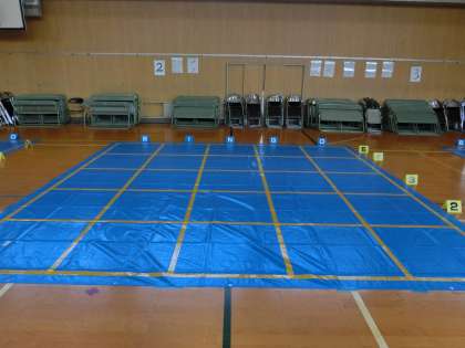 小学校の体育館に、紅白の小さな砂袋と、碁盤目状のブルーシート。