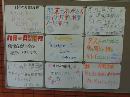 昨日の集会で報告された、生徒会専門委員会の「11月の目標」。
