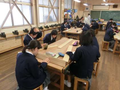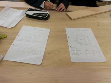 実習開始。木材と金属の物差しを手に、設計図を睨みながら・・・。