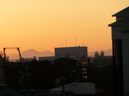 朝焼けに、二上山がくっきりと浮かび上がっています。