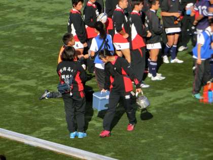 ハーフタイムで汗をぬぐいながら監督・コーチの指示を聞く眼差し。