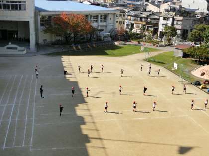 運動場では、体育。これから走る回ります。