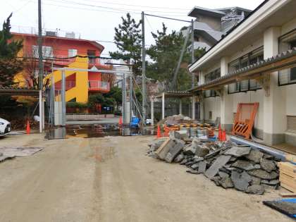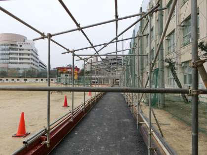 トラック侵入の仮北門は、鉄板が敷き詰められ、準備万端です。