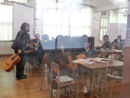 2年生の音楽の授業。クラシックギターの演奏練習です。