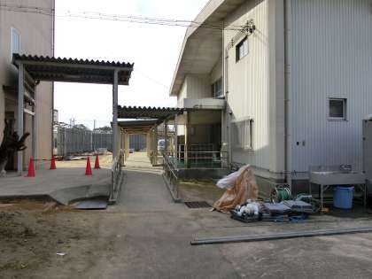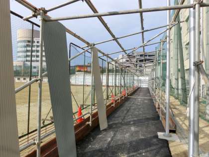歩道の屋根・壁の設置や、資材の搬入など、工事が慌ただしくなってきました。