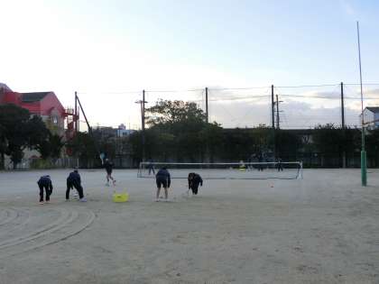 かなりの冷え込み。しかし、ソフトテニス部は早朝から声を出して練習しています。