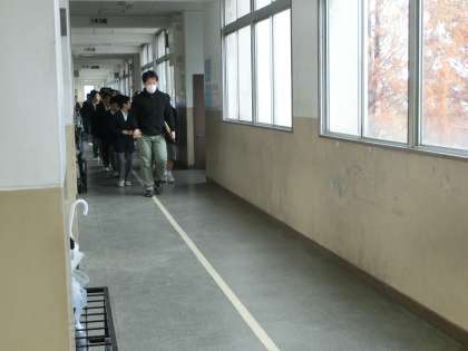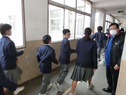 合図のサイレンの後、全校生徒が4階の廊下に避難して行きます。