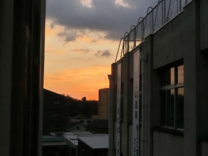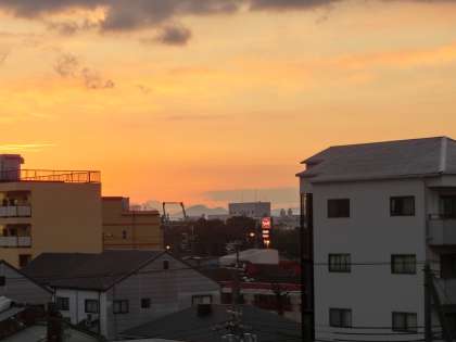 空を雲が覆っていますが、東の空は美しい朝焼けです。