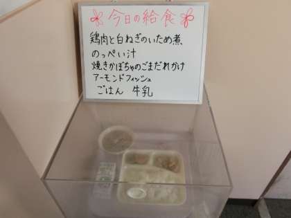 本日のメニューは「のっぺい汁」「鶏肉と白ネギの炒め煮」「焼きかぼちゃ」。
