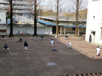 野球部はグランドコンディションが悪く、中庭での練習です。