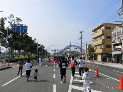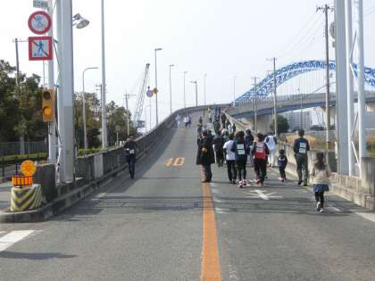 車道の車を閉鎖。一気に千歳橋をのぼります。