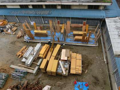 鉄筋の枠組みができ、コンクリートで固めるために、囲いの板が張りめぐらされます。