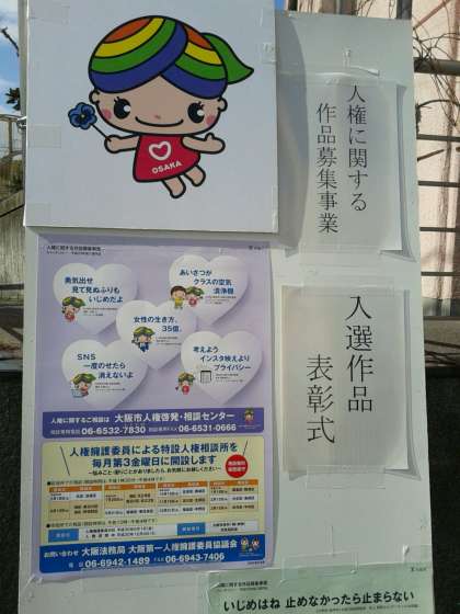 本日、西九条の大阪市立こども文化センターにおいて、人権に関する作品の表彰式が行われ、1年廣田さんが表彰されます。