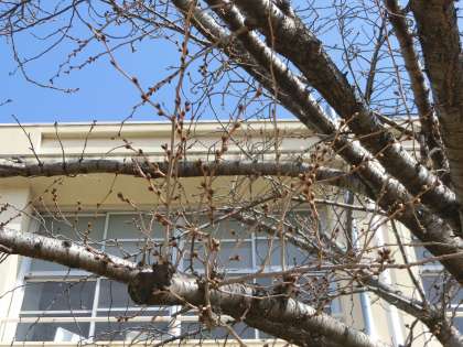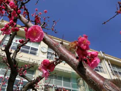 小学校では、紅梅が美しく、桜のつぼみも少し膨らんでいました。