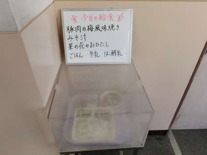 今日のメニューは「豚肉の梅風味焼き」「菜の花のおひたし」「具だくさんのみそ汁」でした。