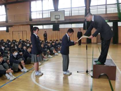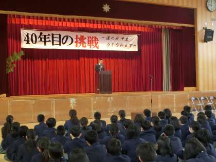 それから、昨日「いじめ」についてのアンケートを実施しました。私たちの基本は、楽しい学校生活です。そこにはいじめや嫌がらせ、仲間外れはいりません。みんなそれぞれの個性があります。みんなが尊重されて、認められて、はじめて楽しい学校生活となります。新しい年は、いじめのない一年となるよう努力していきましょう。