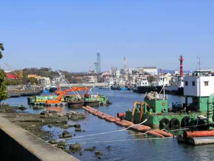公園から見る大正内港と昭和山、そしてハルカス。