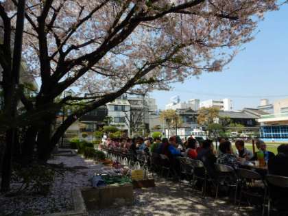 本日、泉尾東小学校で社会福祉協議会主催の「高齢者食事サービスお花見会」が行われました。風とともに桜の花びらが舞う中で、桜の花とおいしいお弁当を楽しみました。長年にわたって地域を支えてこられたお年寄りの方々、いつまでもお元気でいてください。