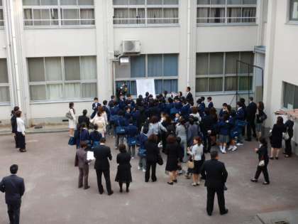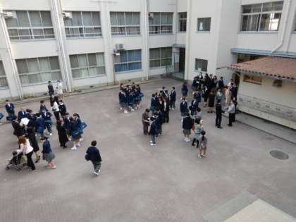 クラス発表の時間前からたくさんの新入生たちが登校して待っています。クラス発表の掲示が始まった瞬間、歓声とともに駆け寄ります。さあ、どのクラスになったかな?