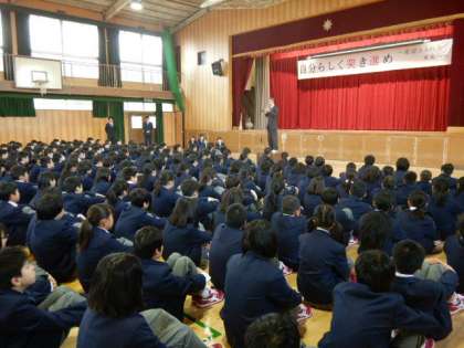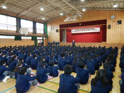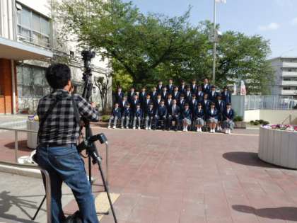 新学期が始まってから1週間がたち、初めての朝の全校集会です。校長先生からは、「起床時間」「就寝時間」「勉強を始める時間」を決めて、規則正しい生活リズムをつかむ「3点固定」のお話がありました。みんなしっかりと話を聴いていました。集会終了後は順に学級写真撮影がありました。