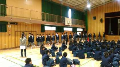 本日より一泊二日で1年生の宿泊オリエンテーションを行います。出発前にガイダンス?として体育館で集団での歩行練習等を行っています。