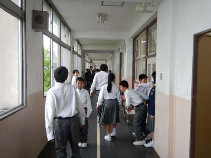 「ただいま火災が発生しました」「場所は南館1階理科室です」「今すぐ避難を開始してください」という緊急放送に生徒たちは素早く教室前の廊下に整列し、静かに落ち着いて階段をおり、避難場所に移動しました。今日はあいにくの雨だったために、運動場ではなく体育館に避難という設定にしましたが、消防署の方から褒めていただくほどの真剣で落ち着いた行動でした。