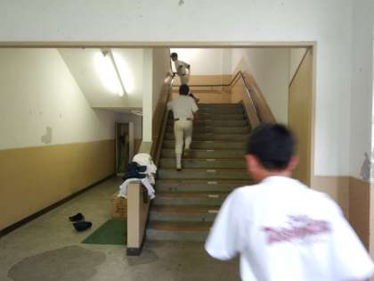 学校内では雨のためにグランドの部活動が校舎内でトレーニングをしています。