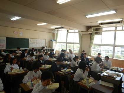 今日の献立は、鶏肉のオイスターソース焼き、中華スープ、ツナと野菜のごまいため、固形チーズ、牛乳です。写真は1年1組と1年2組です。