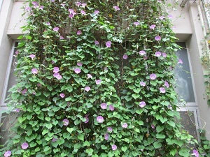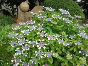 現在、私たちの目を楽しませてくれているのが、玄関前のガクアジサイと、壁面緑化のリュウキュウアサガオです。ともにブルーの色が鮮やかで、雨の日も映えます。