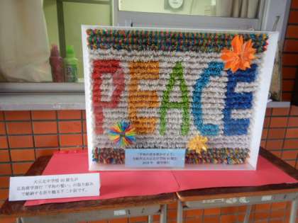 大正北中学校40期生が修学旅行に向けての取り組みで折った千羽鶴が玄関に飾られています。明日出発する修学旅行の中の、広島平和記念公園における平和セレモニーで奉納します。