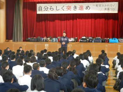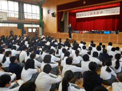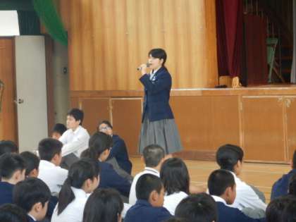 今日の全校集会では、電車の中でのエピソードをもとに、一人一人の振舞いがその集団の印象につながってしまうことになるという話が、校長先生と生活指導担当の先生よりありました。生徒会からは今週の予定についての連絡がありました。