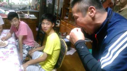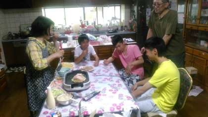 夕食中です。生徒が芋からつくった手づくりのコンニャクを試食させてもらいました。美味しかったです。