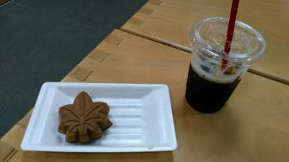 焼きたてのもみじ饅頭とアイスコーヒーをいただいています。饅頭はすごく甘いです。