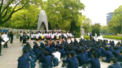 原爆の子の像の前に着きました。小学生が平和セレモニーをしています。