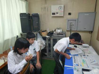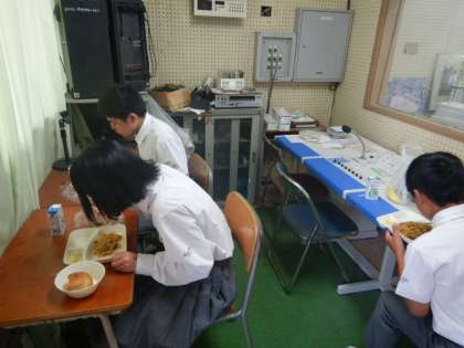 今日は1年生の文化委員が放送室で給食を食べた後、生徒会役員に放送機器の操作方法の説明を受けていました。