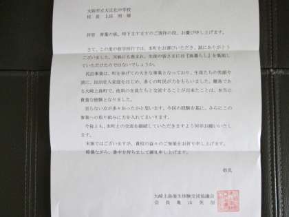 先日、修学旅行でお世話になりました広島県の大崎上島から、お便りをいただきました。とても嬉しく、また懐かしく、様々な自然体験と、お別れの離島式での涙や感動がよみがえってきます。また機会があれば、行ってみたいですね。